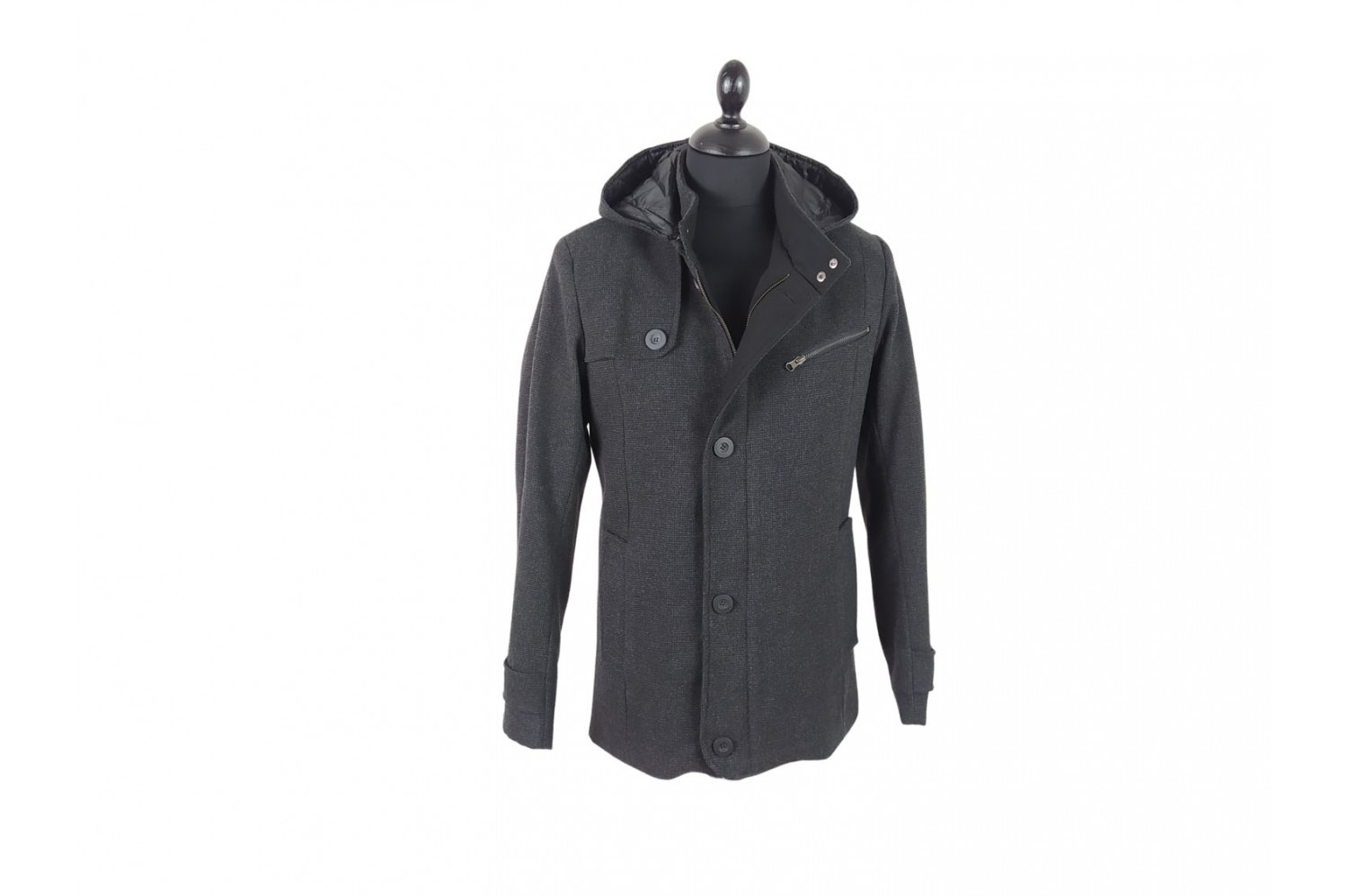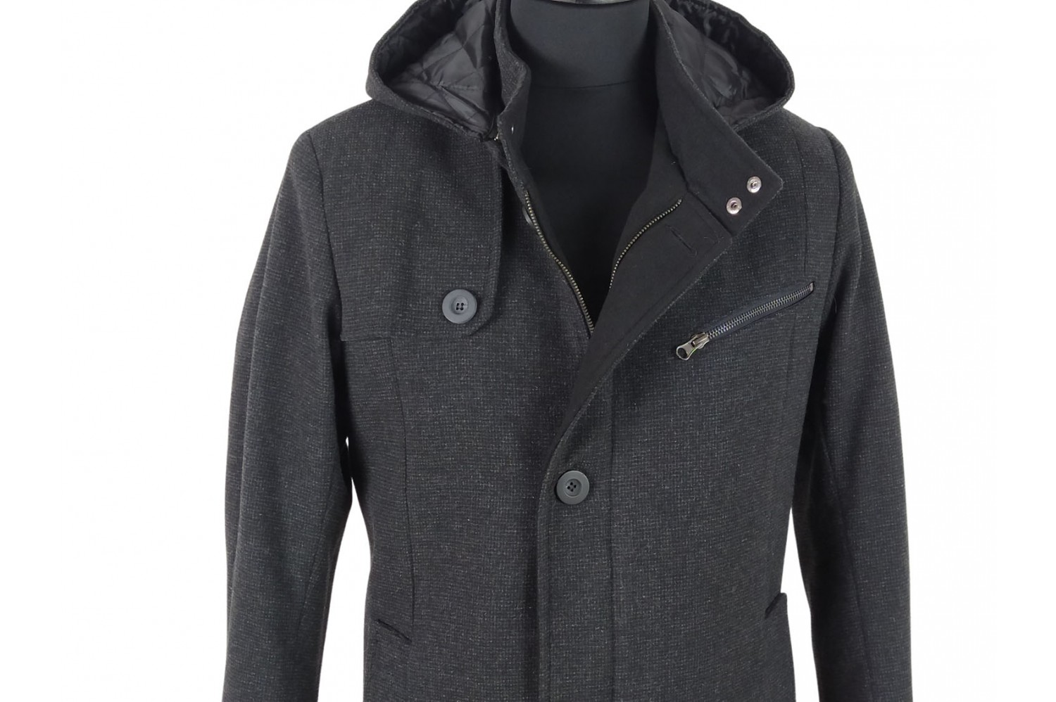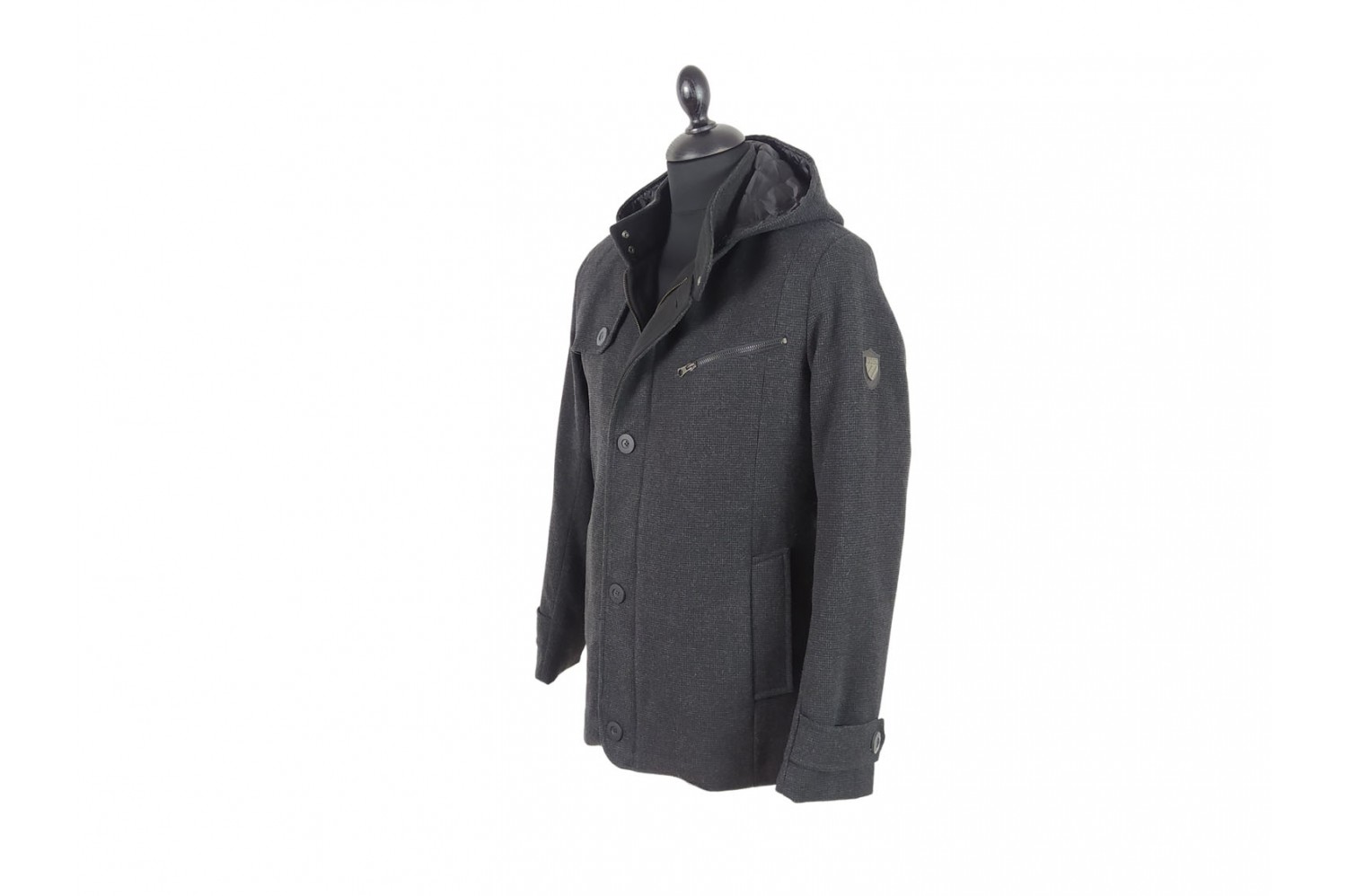 Ημίπαλτο με δύο λόξες τσέπες , βερμουάρ και κουμπιά μπροστά και αφαιρούμενη κουκούλα. Σχέδιο υφάσματος pti karo , σε χρώμα ΑΝΘΡΑΚΙ